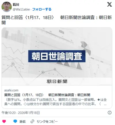 新党「中道改革連合」に「期待する」は28%…衆院解散に賛成36%、反対50%…朝日世論調査