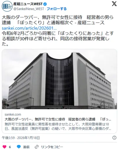 大阪のダーツバー、無許可で女性に接待 経営者の男ら逮捕 「ぼったくり」と通報相次ぐ