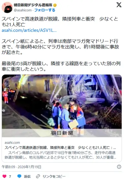 スペインで高速鉄道が脱線、隣接列車と衝突 少なくとも21人死亡