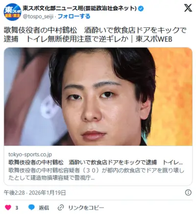 【芸能】歌舞伎役者の中村鶴松容疑者 酒酔いでケバブ店ドアをキックで蹴り壊し逮捕 トイレ無断使用注意で逆ギレか 容疑を否認