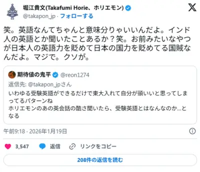 「ホリエモンのあの英会話の酷さ聞いたら…」ホリエモン、英会話めぐる難癖に持論 「ちゃんと意味分りゃいいんだよ。クソが」