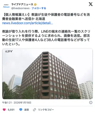 消費者金融業者から生徒へSMS「教諭の借金が滞っているので返済するように伝えてほしい」
