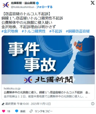公費解体中の元旅館に侵入、銅線1㌧窃盗容疑のトルコ人不起訴 金沢地検、不起訴理由は明かさず