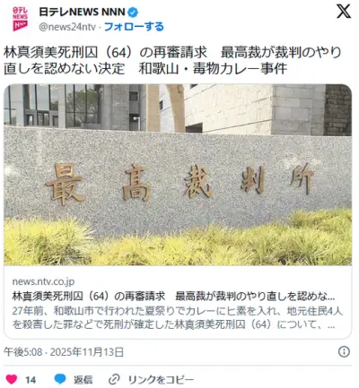 林真須美死刑囚(64)の再審請求 最高裁が裁判のやり直しを認めない決定 和歌山・毒物カレー事件