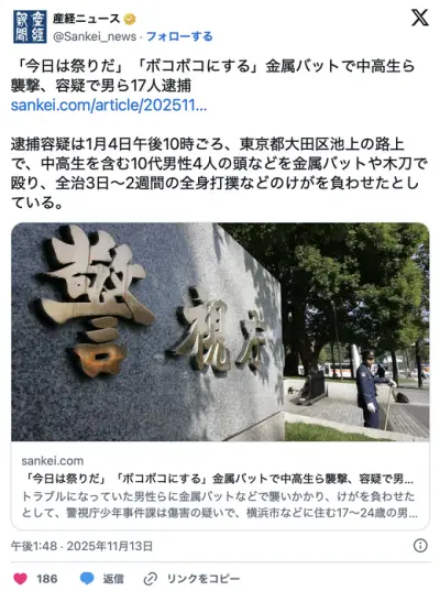 【神奈川】「今日は祭りだ」「ボコボコにする」金属バットで中高生ら襲撃、容疑で男ら17人逮捕