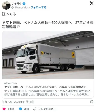 ヤマト運輸「ベトナム人運転手を500人採用します」