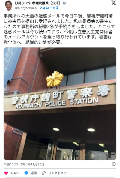 元TBSの立憲・杉尾氏、日本国民からの意見に対し「なぜ政権が変わったら迷惑メールが大量に来るのだ」