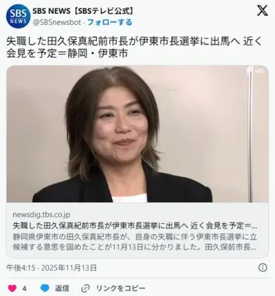 【伊東市】失職した田久保真紀前市長が伊東市長選挙に出馬へ 近く会見を予定=静岡