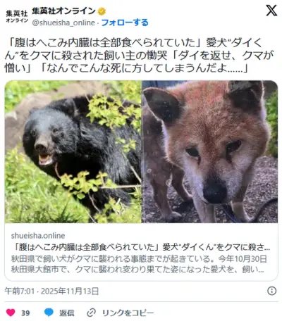 「腹はへこみ内臓は全部食べられていた」愛犬“ダイくん”をクマに殺された飼い主の慟哭「ダイを返せ、クマが憎い」 秋田