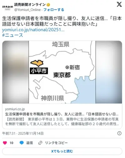 【東京】生活保護申請者を小平市職員の20代男性が隠し撮り、友人に送信…「日本語話せない日本国籍だったことに興味抱いた」