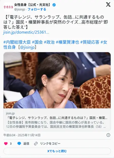 「電子レンジ、サランラップ、缶詰…に共通するものは?」榛葉幹事長が突然のクイズ…🙋♀高市総理が即答