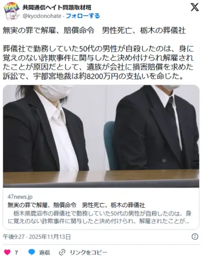 【栃木】無実の罪で解雇し50代男性自殺 会社幹部が証拠を作成し取り調べを受けさせる 8200万円の賠償命令 鹿沼市の葬儀社