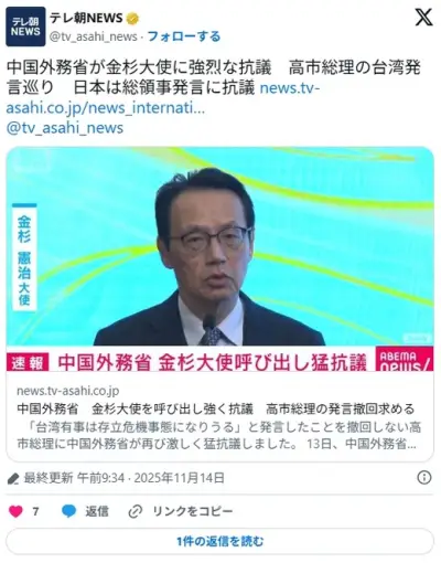 「14億人の中国人民は決して許さない」 中国外務省 金杉大使を呼び出し強く抗議 高市総理発言の撤回求める