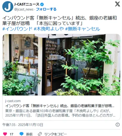 【東京】インバウンド客「無断キャンセル」続出、銀座の老舗和菓子屋が悲鳴 「本当に困っています」