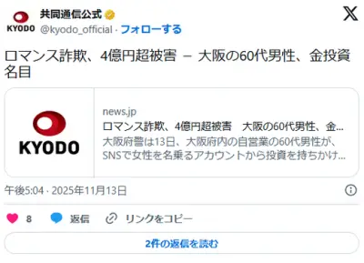 【ロマンス詐欺】4億円超被害 大阪の60代男性、金投資名目-大阪府