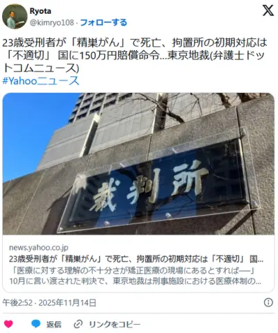 23歳受刑者が「精巣がん」で死亡、拘置所の初期対応は「不適切」 国に150万円賠償命令…東京地裁