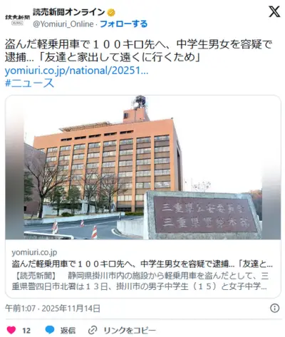盗んだ軽乗用車で100キロ先の三重県四日市市へ、静岡県掛川市の中学生男女を容疑で逮捕…「友達と家出して遠くに行くため」