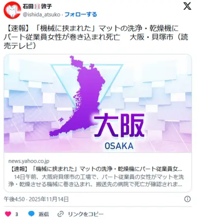 【大阪】「機械に挟まれた」マットの洗浄・乾燥機にパート従業員女性が巻き込まれ死亡 貝塚市