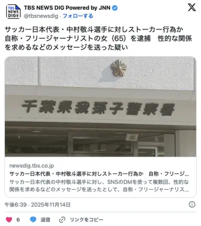 ジャーナリスト川野美由紀(65)がサッカー選手中村敬斗(25)にストーキング、繰り返し性的関係を求める