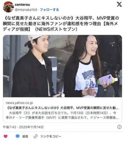 【悲報】大谷さん、MVP受賞で真美子じゃなくデコピンにキスをして炎上