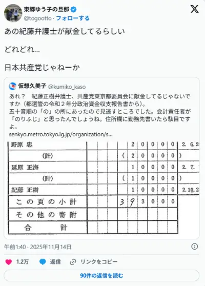 【炎上】 紀藤弁護士さん 共産党に献金している疑惑が浮上 →