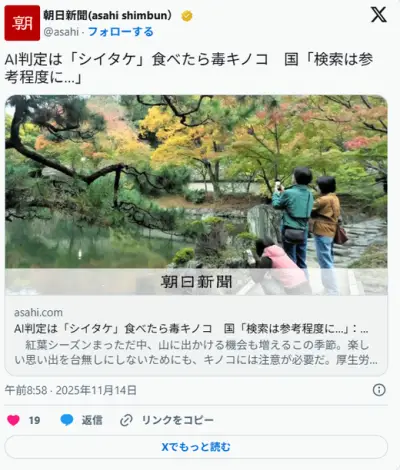 AI判定は「シイタケ」食べたら毒キノコ、和歌山市の70代男性が食中毒に