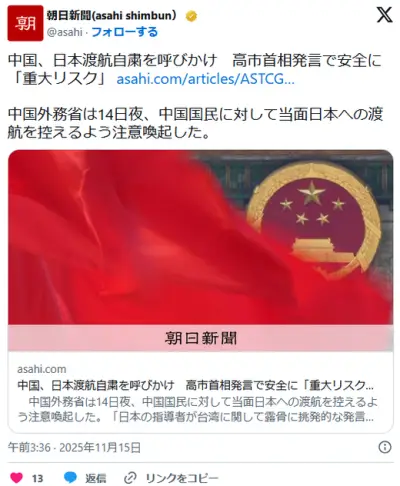 【速報】中国外務省、日本への渡航自粛呼びかけ