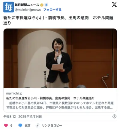 【ラブホ】新たに市長選なら小川晶・前橋市長、出馬の意向 ホテル問題巡り 群馬