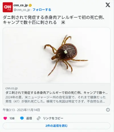 【悲報】ダニに刺されて肉アレルギーを発症→知らずに肉を食べて死亡