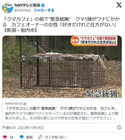 【(・(ェ)・)】「クマカフェ」の前で緊急銃猟 クマ1頭がワナにかかる カフェオーナーの女性「好きだけれど仕方がない」新潟・胎内市