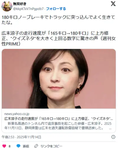 【芸能】書類送検 広末涼子の走行速度が「165キロ→180キロ」に上方修正 クイズネタを大きく上回る数字に驚きの声