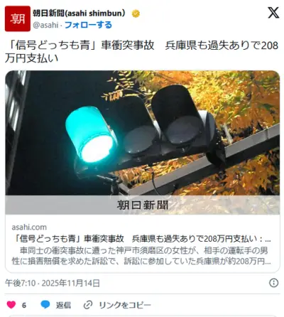 【神戸】「信号どっちも青」車衝突事故 兵庫県も過失ありで208万円支払い