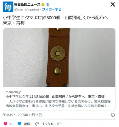 【🛎】東京・青梅市 小中学生にクマよけ鈴8000個 山間部近くから配布へ