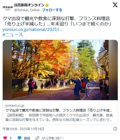 【(・(ェ)・)】クマ出没で観光や飲食に深刻な打撃、フランス料理店「売り上げ半減した」…年末迫り「いつまで続くのか」