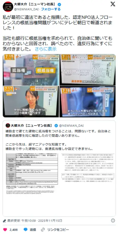 NPO法人フローレンス、補助金で建てたものを根抵当権の担保にする違法状態だった 代表理事も認める