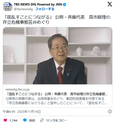 台湾有事に伴う日本のシーレーン封鎖は存立危機ではないと創価公明党