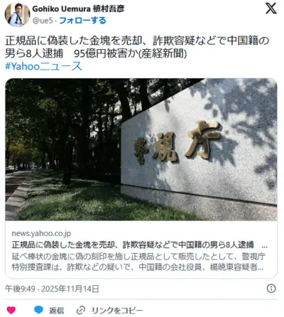 中国籍の男ら8人を逮捕、日本で偽装した金塊を売却して95億円の詐欺容疑、特殊詐欺の金か、利益は暗号資産に変えマネーロンダ