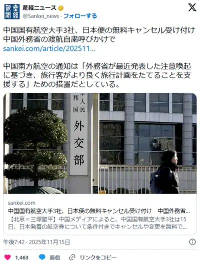 【存立危機事態】中国国有航空大手3社、日本便の無料キャンセル受け付け 中国外務省の渡航自粛呼びかけで