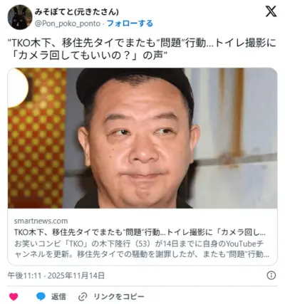 【芸能】TKO木下、移住先タイでまたも“問題”行動… トイレ撮影に「カメラ回してもいいの?」の声