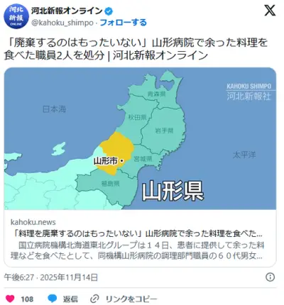 「廃棄するのはもったいない」山形病院で余った料理を食べた職員2人を処分