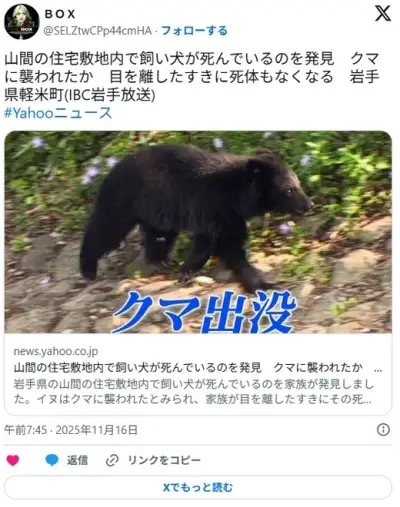 【(・(ェ)・)】山間の住宅敷地内で飼い犬が死んでいるのを発見 クマに襲われたか 目を離したすきに死体もなくなる