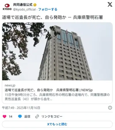 【兵庫県警】明石署の道場で巡査長(43)が死亡、自ら発砲か