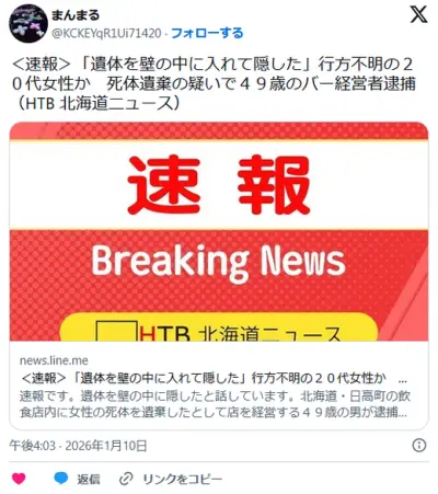 「遺体を壁の中に入れて隠した」行方不明の20代女性か 死体遺棄の疑いで49歳のバー経営者逮捕 北海道