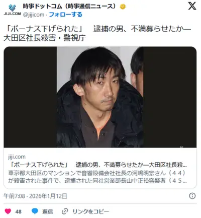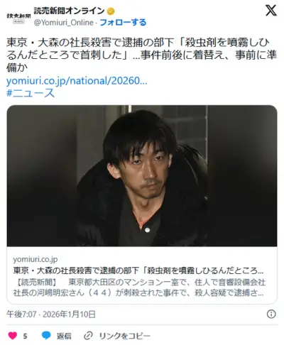 【東京】大田区・大森の社長殺害で逮捕の部下「殺虫剤を噴霧しひるんだところで首刺した」…事件前後に着替え、事前に準備か