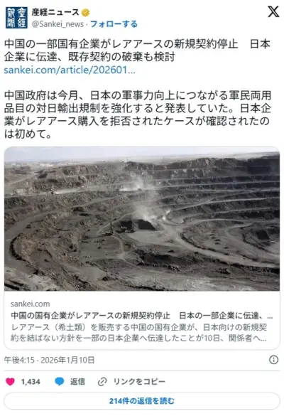 【日中】中国、レアアース新規契約停止 国有企業、「既存取引破棄」も検討