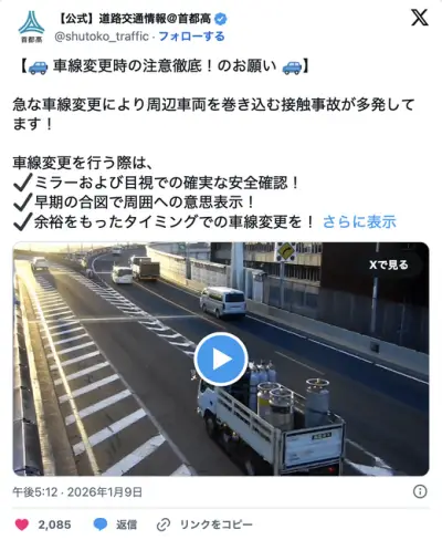 【事故】首都高が動画を公開し注意喚起!車線変更ではミラーを確認して余裕を持って!