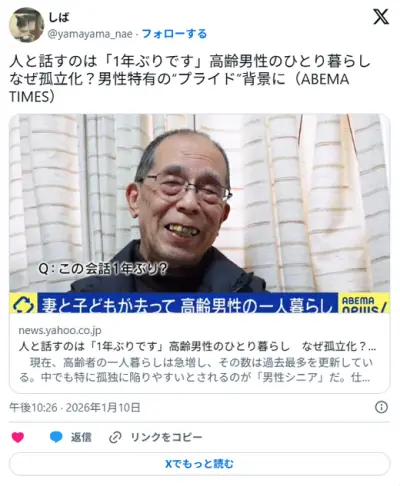 人と話すのは「1年ぶりです」高齢男性のひとり暮らし なぜ孤立化?男性特有の“プライド”背景に