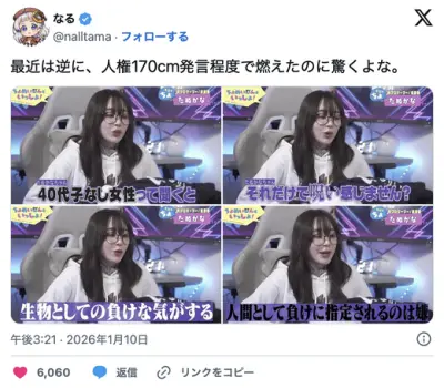 たぬかな「40代子なし女性は生物として負け」