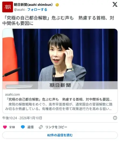 「究極の自己都合解散」危ぶむ声も 熟慮する首相、対中関係も要因に(朝日)