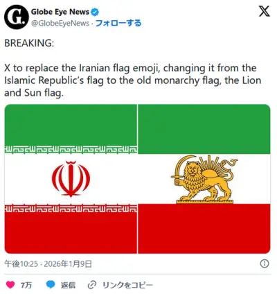 X、イラン国旗の絵文字がイスラム共和国のものから旧君主制のものに変更される